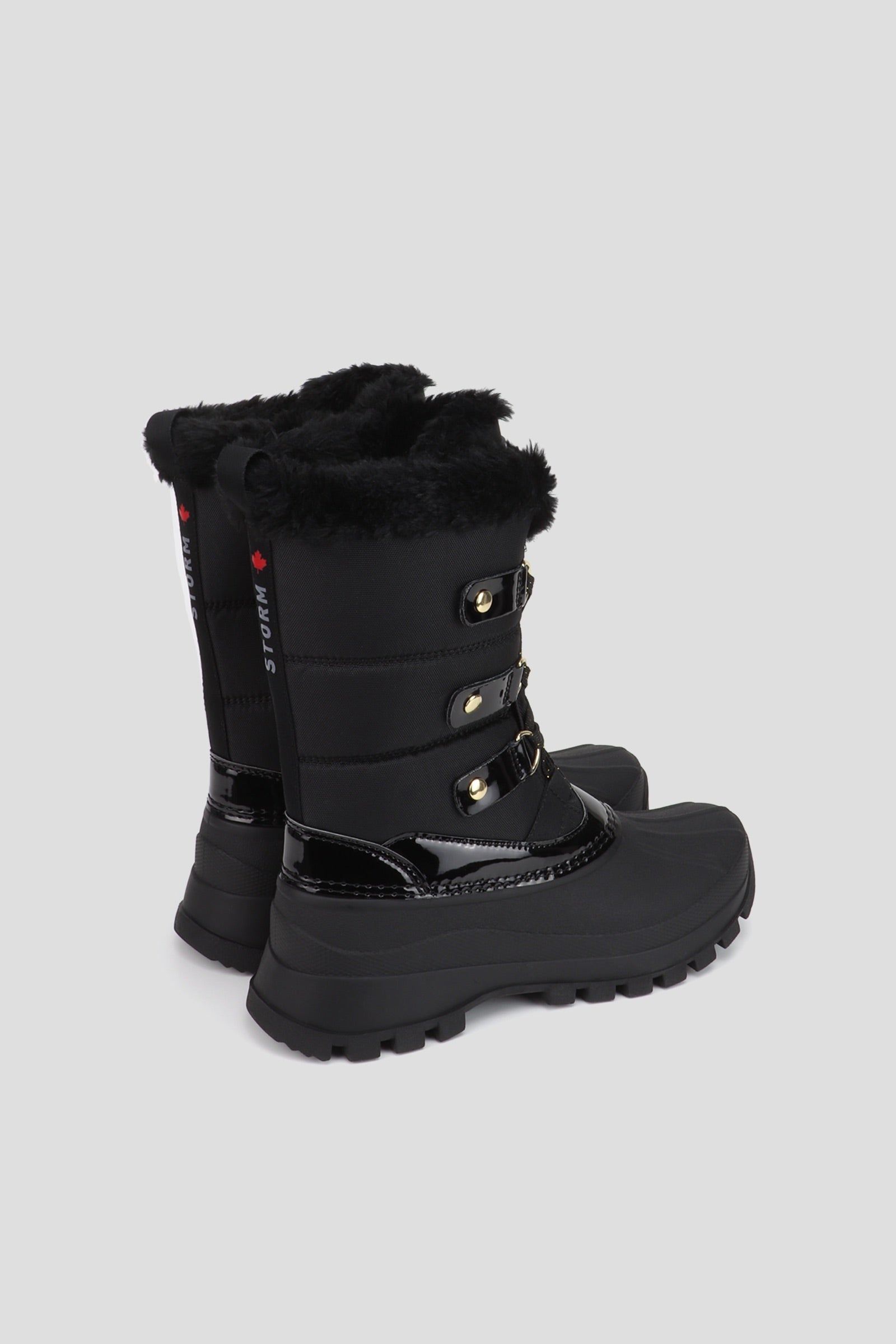 • Patent Detailing and Faux Fur Trim for Added Style